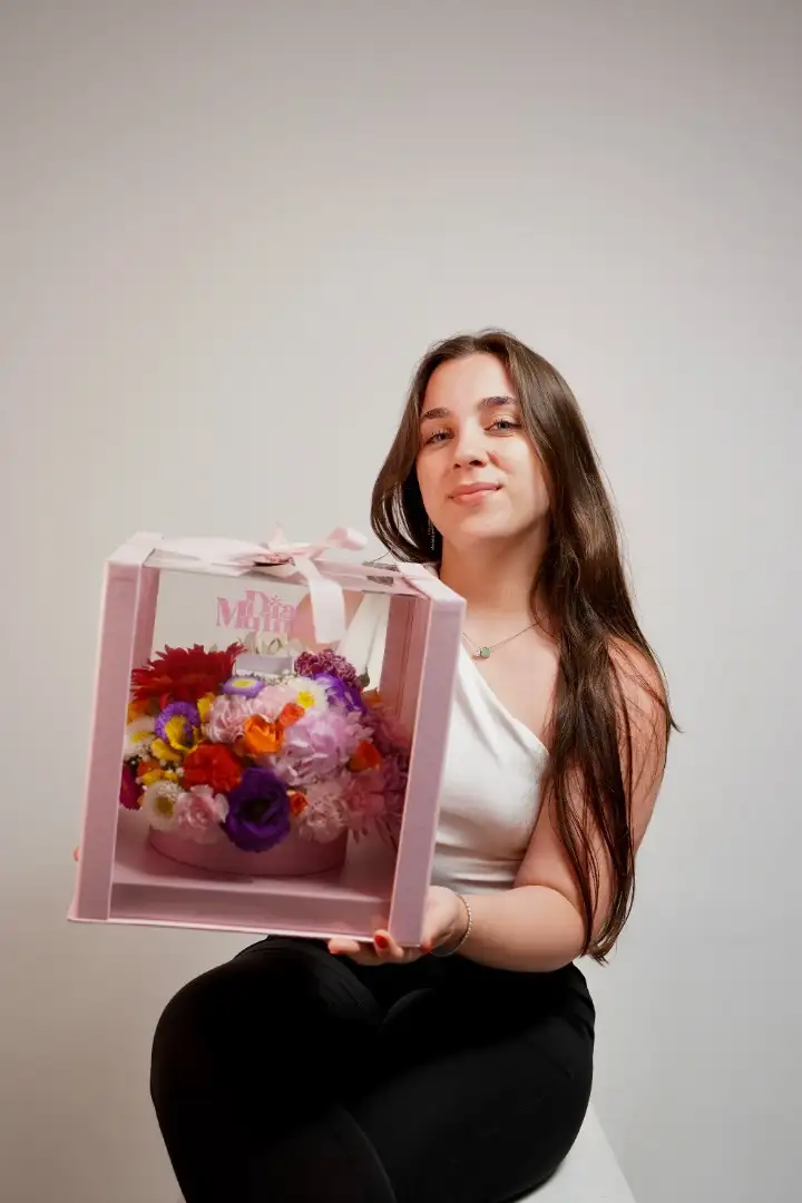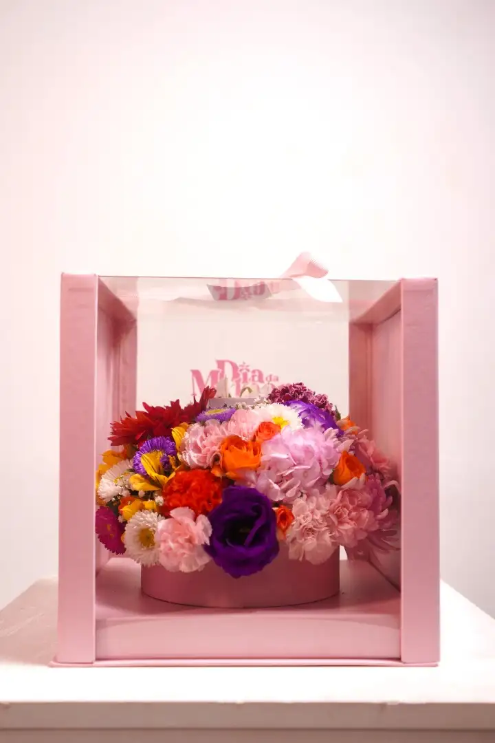 Box de flores em caixa temática com acetato para o Dia Internacional da Mulher. Composta por flores mistas coloridas e um colar com píngente da marca Mariana Amaral.