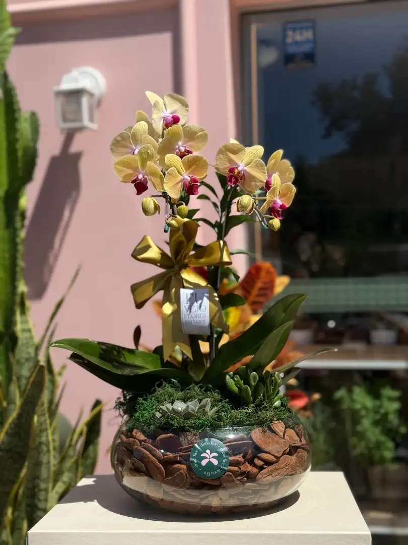 Orquídea Pahalenopsis em vaso terrário de vidro com suculentas.