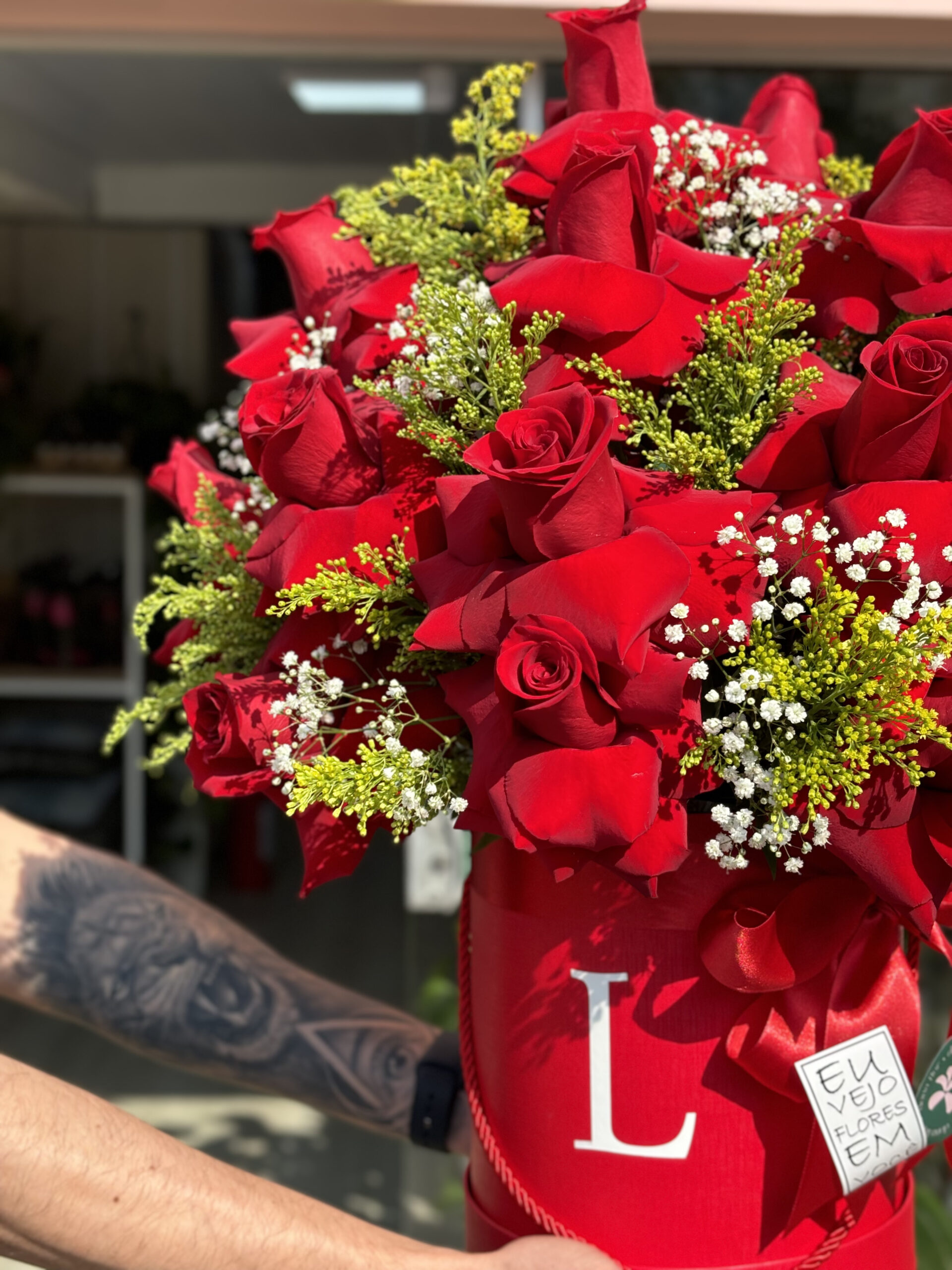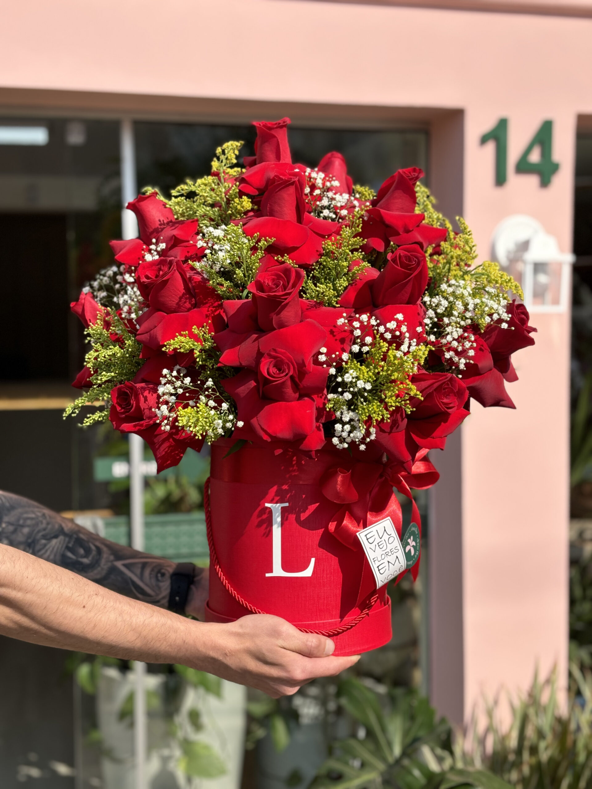 Box de Flores composta por Rosas Importadas Vermelhas e acabamentos.