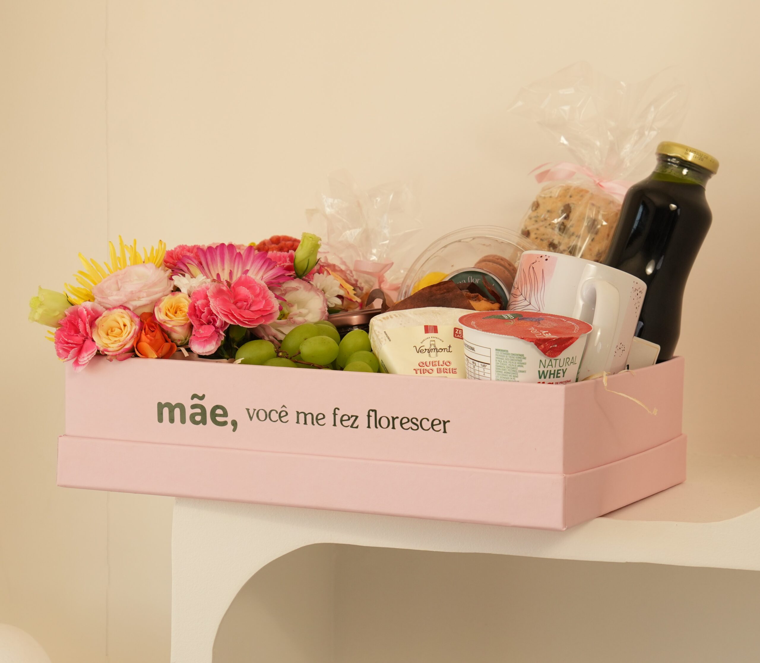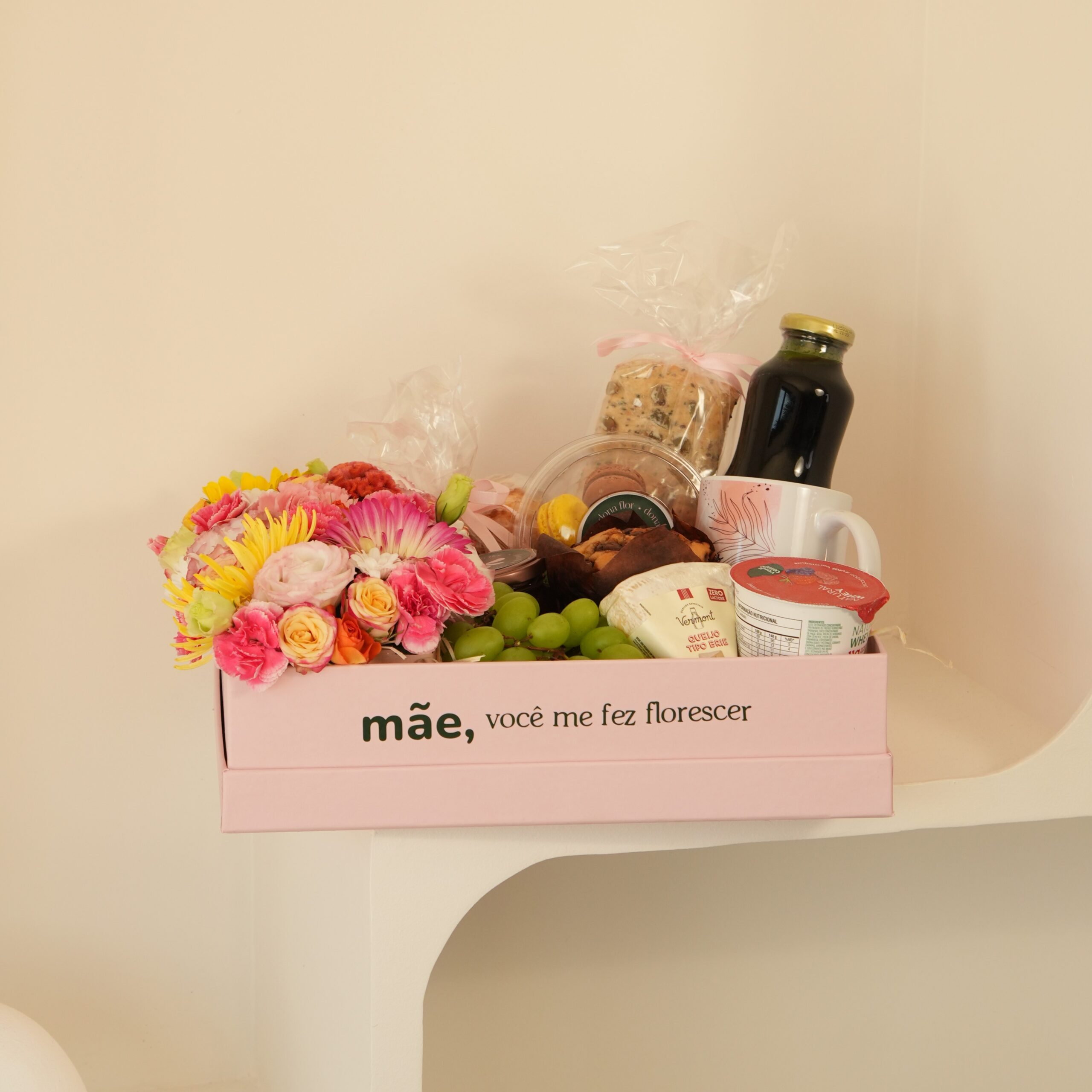 Composto por um lindo arranjo de flores mistas em tons coloridos e deliciosos itens para iniciar o dia dela da forma mais especial!