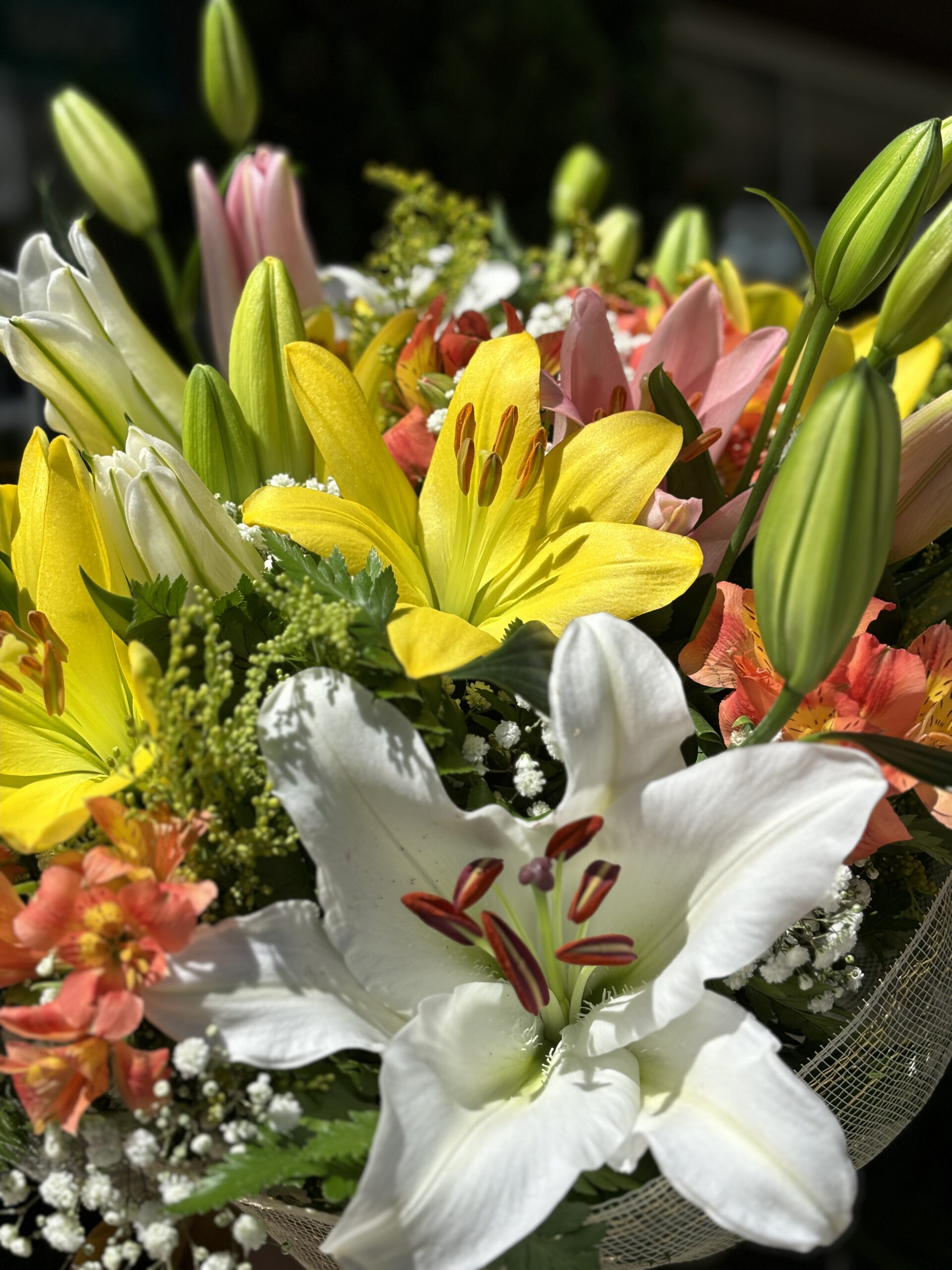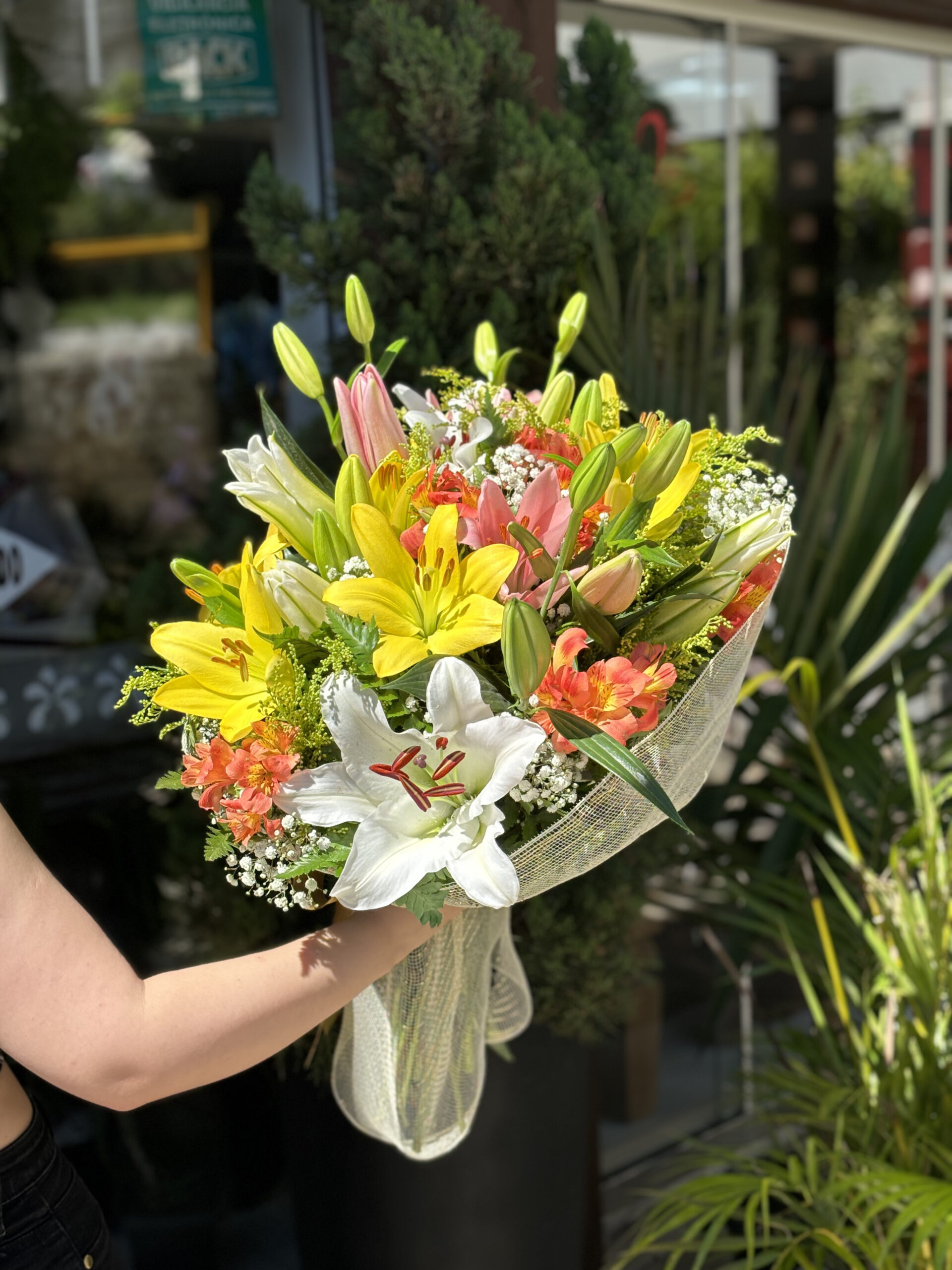 Buquê composto por Lírios Coloridos e Astromélias, com acabamentos.